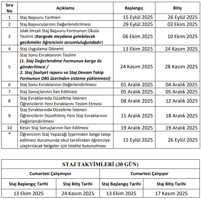 - Resmi tatil günlerinde yapılan çalışmalar staj çalışması olarak sayılmaz (23 Nisan, 15 Temmuz vb.).