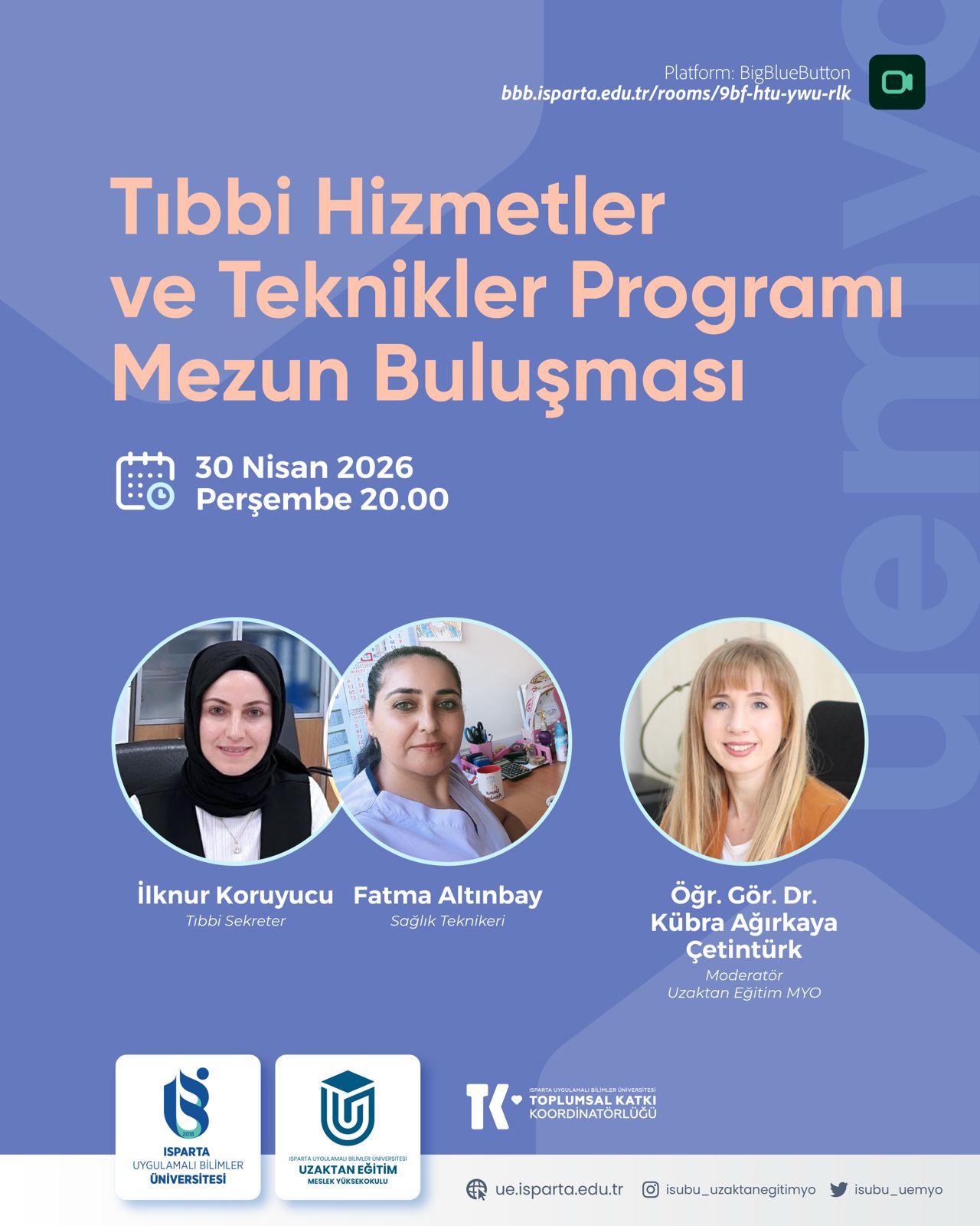 30 Nisan 2026 saat 20:00’da İlknur KORUCUYU ve Fatma ALTINBAY'ın katılımı ile Uzaktan Eğitim Meslek Yüksekokulu tarafından gerçekleştirilecek "Tıbbi Hizmetler ve Teknikler Programı Mezun Buluşması" isimli online etkinliğimize tüm öğrencilerimiz davetlidir.
