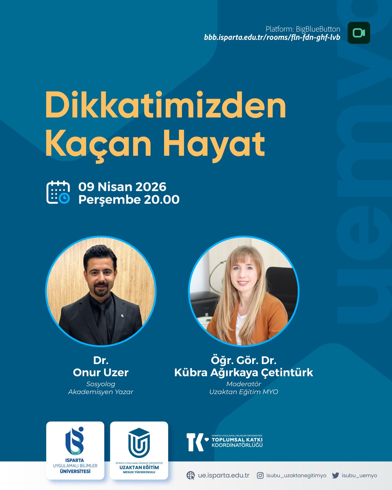 09 Nisan 2026 saat 20:00’da Sosyolog Dr. Onur UZER'in anlatımı ile gerçekleşecek "Dikkatimizden Kaçan Hayat" isimli online etkinliğimize tüm öğrencilerimiz davetlidir.