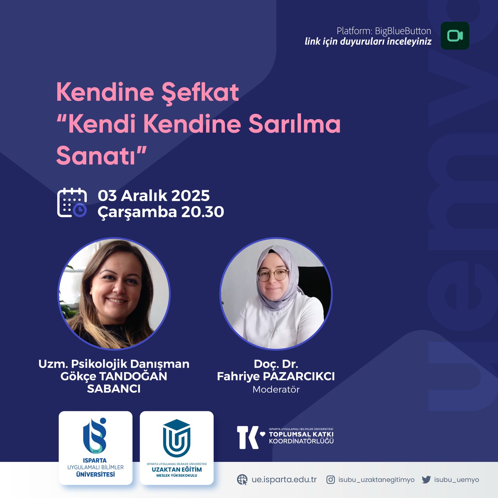 03 Aralık 2025 saat 20:30’da Uzm. Psikolojik Danışman Gökçe TANDOĞAN SABANCI'nın anlatımı ile gerçekleşecek "Kendine Şefkat (Kendi Kendine Sarılma Sanatı)" isimli online etkinliğimize tüm öğrencilerimiz davetlidir.